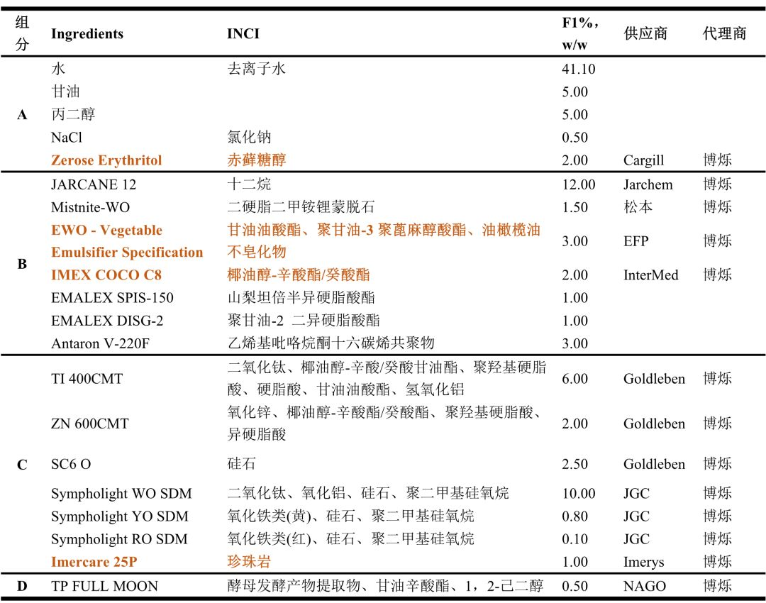 結合Cargill的赤藓糖醇,在使用時(shí)具有清涼的效果;選用InterMed的植物來(lái)源的油脂,使膚色變得更加明亮清新(xīn);